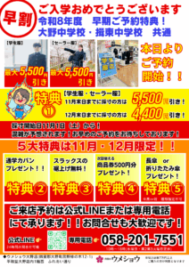 ※大野町内の小学校は卒業式に中学の制服を着る学校もあるので卒業式までにはご準備します。